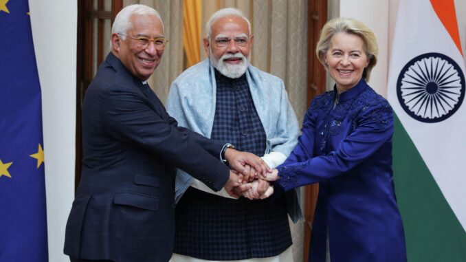 Hindistan Başbakanı Narendra Modi, AB önderleri Costa ve Ursula von Der Leyen ile bugün yapılan görüşmelerin akabinde yapılan ortak basın toplantısında Hindistan ve Avrupa Birliği‘nin, ABD ile istikrarsız alakalara karşı tedbir almak gayesiyle ‘tarihi bir ticaret anlaşmasını’ sonuçlandırdığını söyledi.